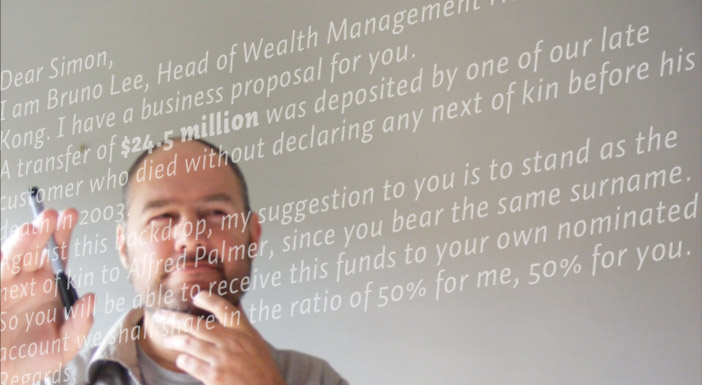 Simon has over 14 years agency experience, he can work from scratch, provide a fresh eye or support your existing design team when things get "full on." He looks forward to discussing your design requirements and business proposals - if you give him work he may even give you his bank details... although, after some consideration he has decided to politely decline the above proposal from Bruno Lee (Head of Wealth Management HSBC, Hong Kong).